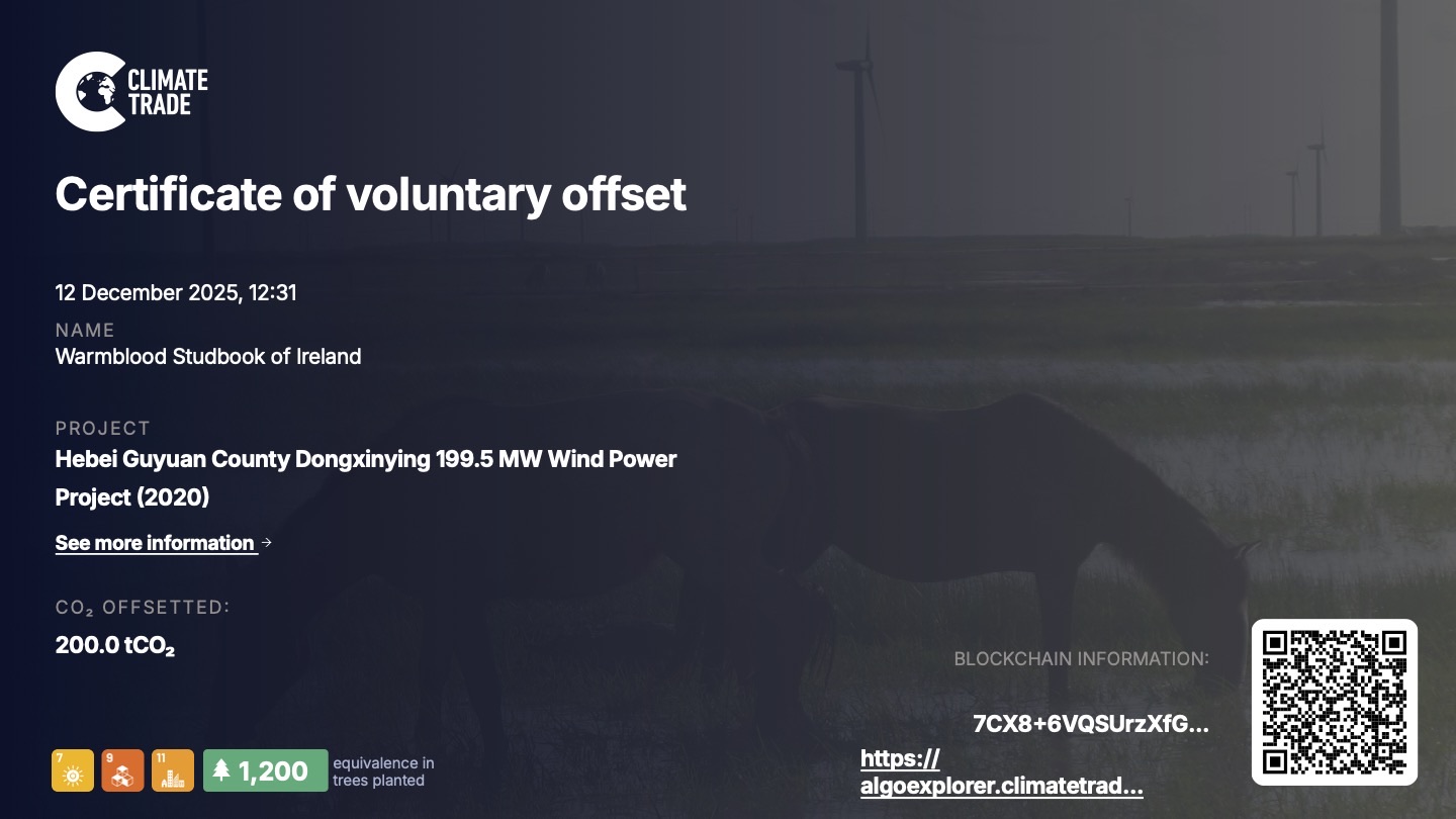 WSI awards the E+ (“Environment Plus”) predicate to every foal and older horse we register, and every stallion and mare we approve, in recognition of our planting a tree on behalf of every animal. And breeders and owners can purchase the CL+ (“Climate Plus”) predicate at the time of registration or later to help offset the carbon hoofprint of their horse from the date of registration forward. The CL+ predicate purchases at least 2 tonnes of carbon offset and 35 trees on behalf of the horse. These purchases are in addition to WSI’s own purchases of trees and carbon offsets.